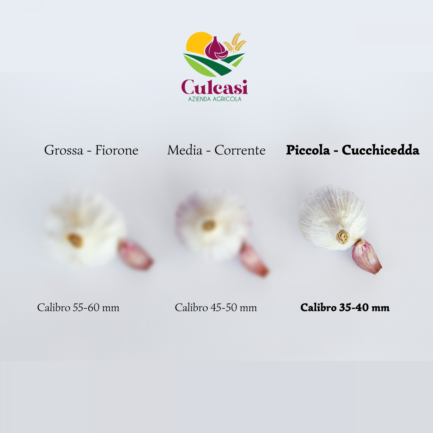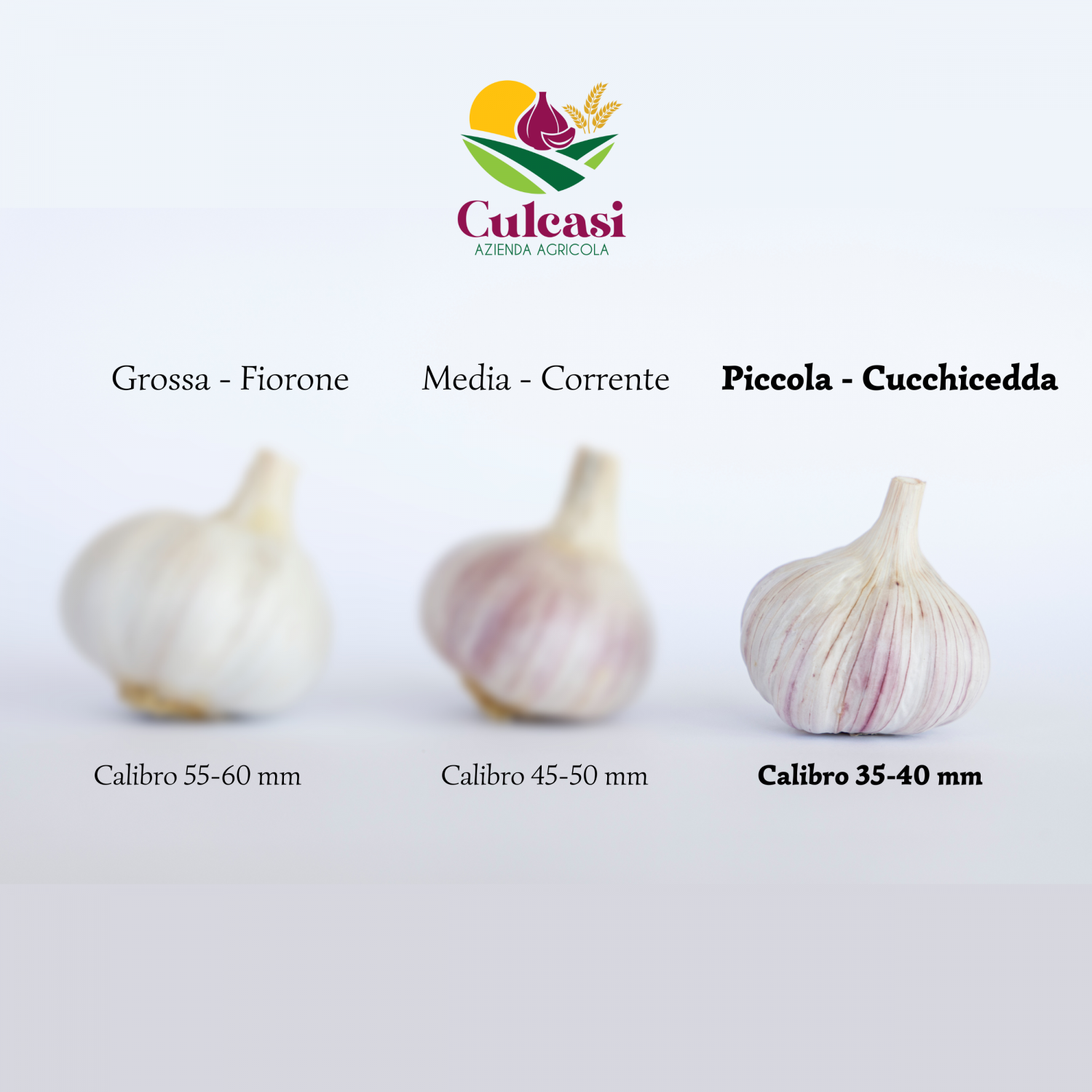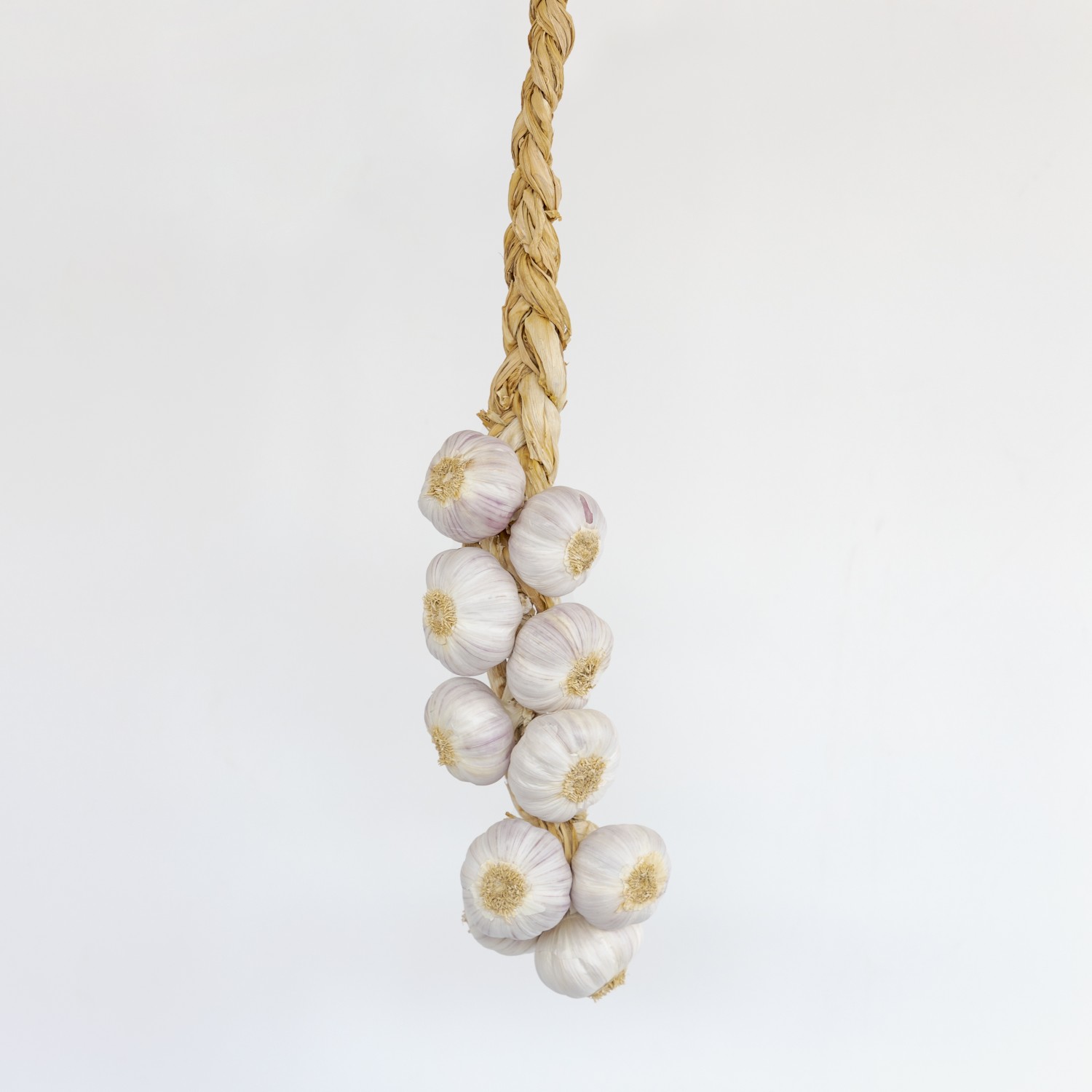 Treccia di aglio rosso di Nubia con 10 teste di aglio di tipologia piccola/cucchicedda (calibro 35-40 mm). Dimensione delle teste: piccola.